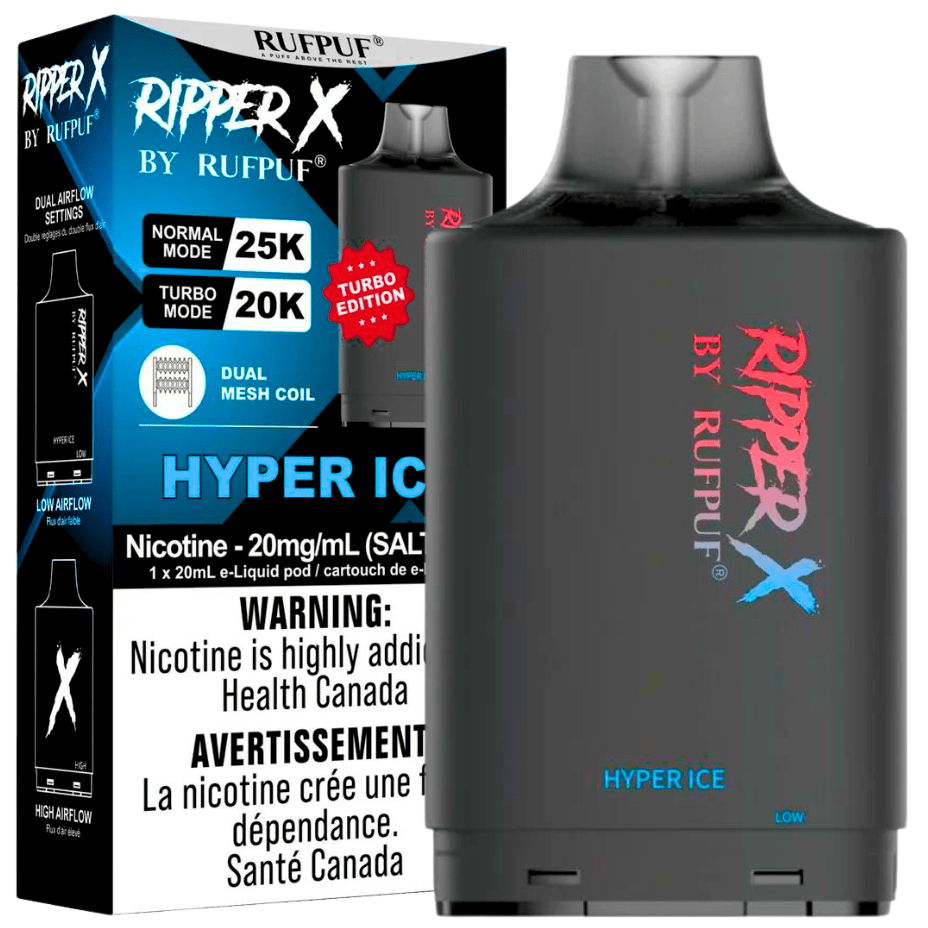 Revitalize your senses with the RufPuf Ripper X 75K Hyper Ice. On the inhale, your taste buds are met with the familiar rush of your favorite fizzy energy drink. Then, a blast of icy coolness on the exhale leaves your mouth tingling with satisfaction. Offering up to 75,000 puffs, these pods come pre-filled with 20mL of satisfying 20mg nicotine.