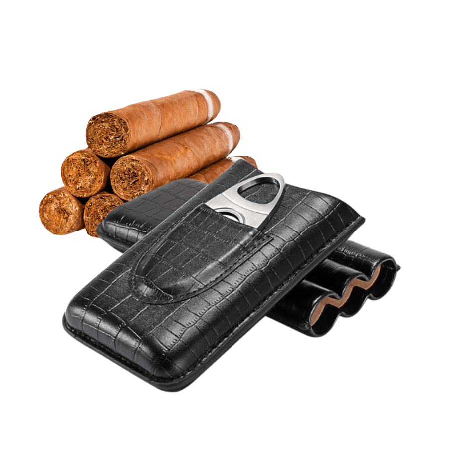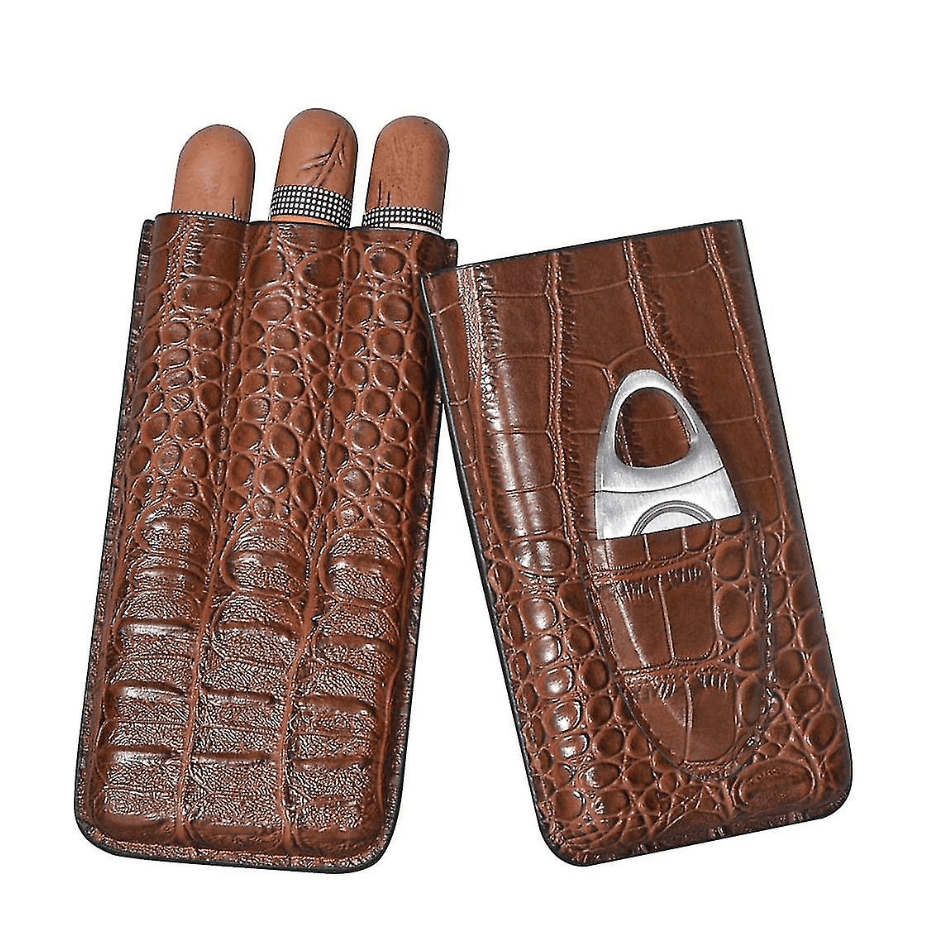 Sikarlan 3 Finger Croc Cigar Case w/Cigar Cutter is made with quality "crocodile" leather with a sophisticated design that can easily hold three 54x8 cigars and comes with a metal double blade 52 ring gauge cigar cutter that fits perfectly snug in the equipped pocket on the outside of the case. You can't deny how appealing this cigar pocket case is.