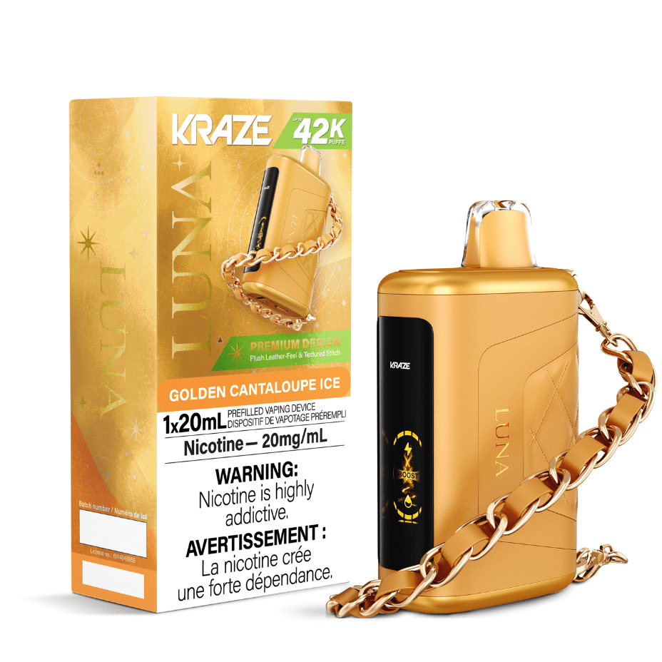 Kraze Luna 42K Disposable Vape is prefilled with 20mL for up to 42,000 puffs, a 0.96-inch HD screen, and adjustable airflow, it delivers a refined vaping experience.