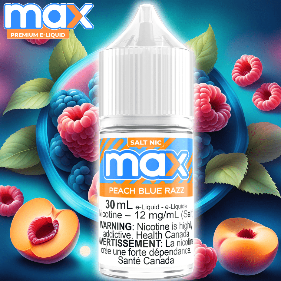 Vape to the MAX with Super Flavours by Max E-Liquid Salts. Give your tastebuds a kick with Max E-Liquid Peach Blue Razz Salt. First, inhale and be delighted at the rush of sticky sweet peaches. Then, a sweet yet tart trail of blue raspberries follows close behind to create an irresistible harmony!