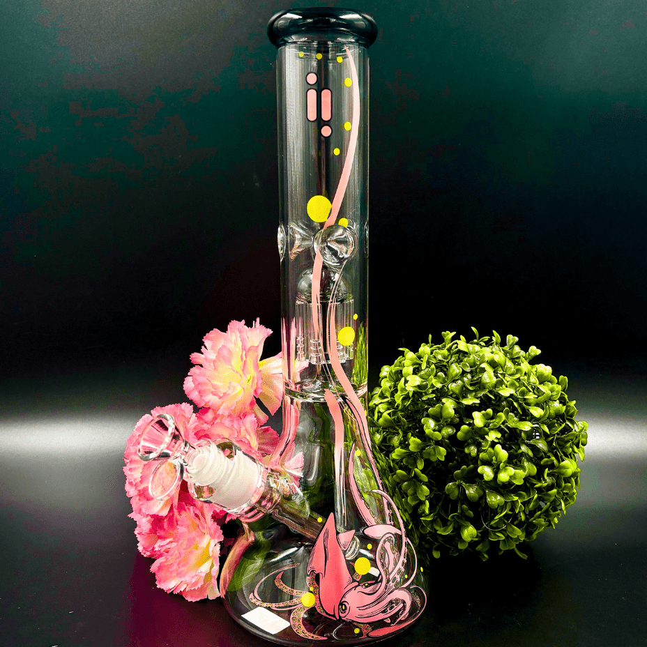 Marvel at the ink-credible 14" Squid Beaker by Infinity Glass! Blown from thick 7mm borosilicate glass, there's no question of durability for this beaker. Designed with a 6-arm tree perc, and a wide beaker base, enjoy smooth smoke from every rip!